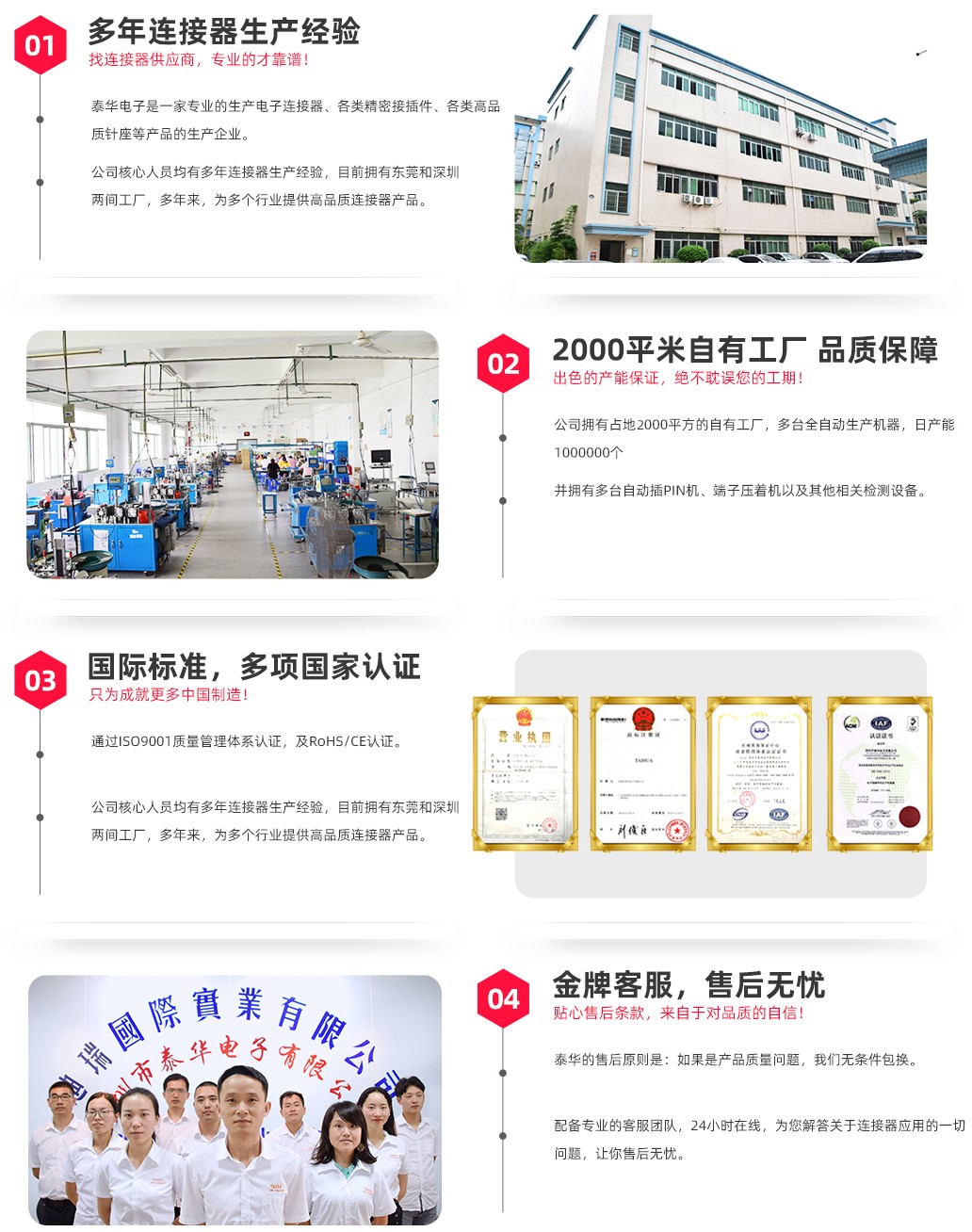 深圳市泰華電子有限公司15年專注連接器,多來成功為全國(guó)2000家大中小型企業(yè)提供專業(yè)的技術(shù)和服務(wù)。本公司具備先進(jìn)的生產(chǎn)設(shè)備,標(biāo)準(zhǔn)化生產(chǎn)流程接插件日產(chǎn)100萬。所有產(chǎn)品通過ISO9001、ROHS等認(rèn)證,自成立以來一直秉承品質(zhì)為先,客戶至上的理念。
